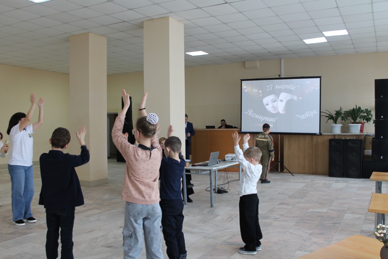 Ведущий мероприятия Владимир Андреев провёл для детей и их родителей интересные тематические викторины и игры. Участники узнали историю театрального искусства, потренировались в основах актёрского мастерства, сделали упражнения для развития дикции и разогрева дыхательного аппарата, поучаствовали в подвижных играх.